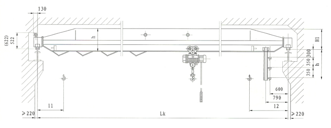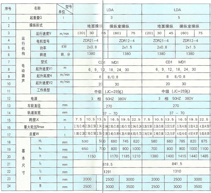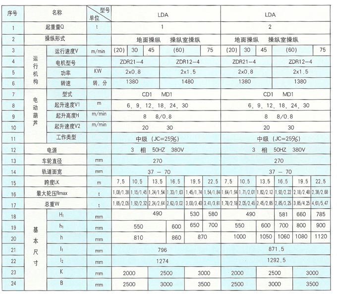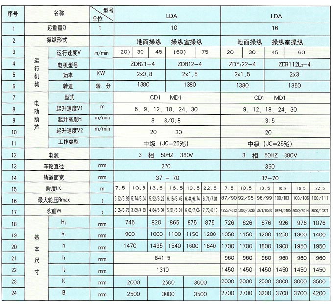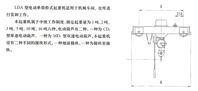LDA型電動單梁橋式起重機多用于機械車間、倉庫進行裝卸工作。 本起重機屬于中級工作制度,額定起重量為噸、2噸、3噸、5噸、10噸、16噸六種。電動葫蘆有兩種,一種是CD1型單速電動葫蘆,一種為MD1型雙速電動葫蘆。本起重機設有兩種不同操縱形式,一種地面操縱、一種是操縱室操縱。