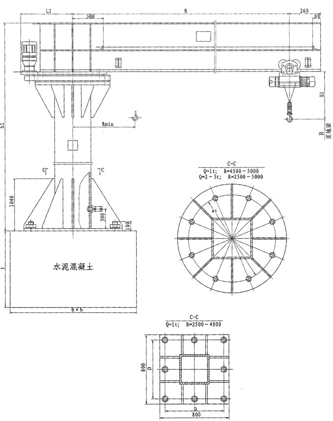 BZD型定柱式全回旋懸臂起重機在BZA的基礎上增加了電動回轉機構,由擺線針輪減速裝置驅動懸臂回轉,電動葫蘆在懸臂工字鋼軌道上作左右直線運動,由電動葫蘆起吊重物,達到了全電動控制,減輕了勞動強度。
